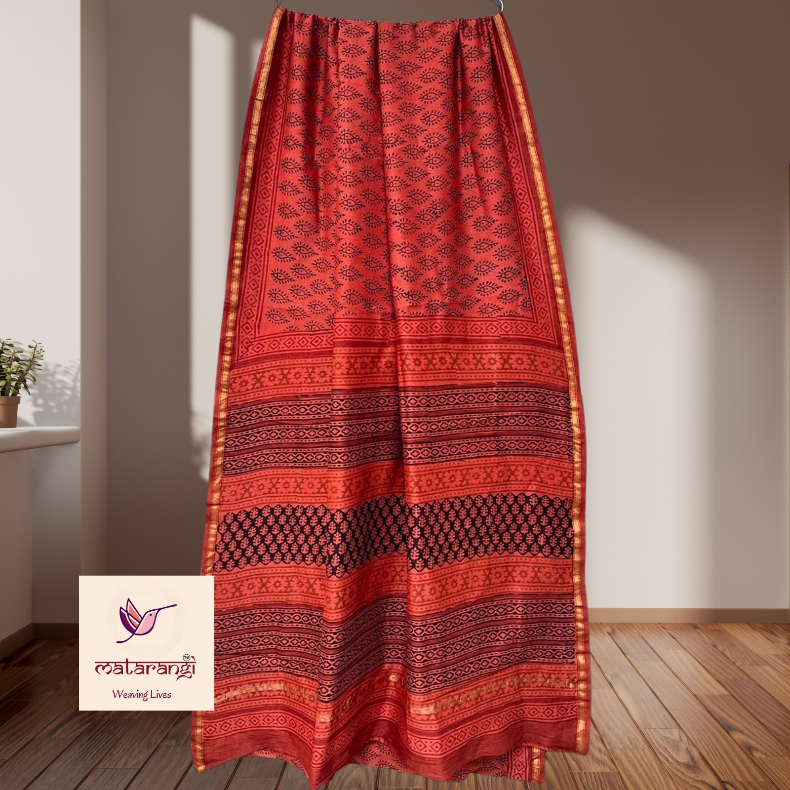 Matarangi Brick Red Hand Block Printed Organic Chanderi Silk Saree
