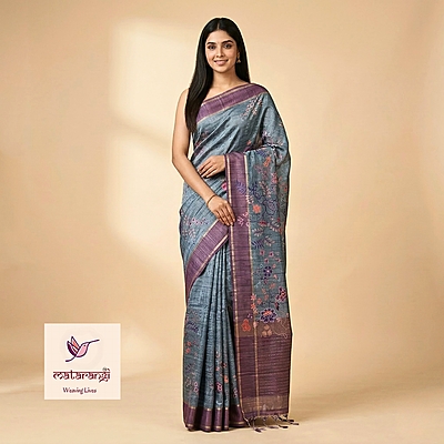 Drape yourself in the serene charm of Teal Blue, woven beautifully in soft Tussar silk. A perfect harmony of subtle shine and timeless sophistication. The digital floral prints and intricate weave that runs throughout the saree makes it a unique ensemble. This saree is paired with a Purple blouse.