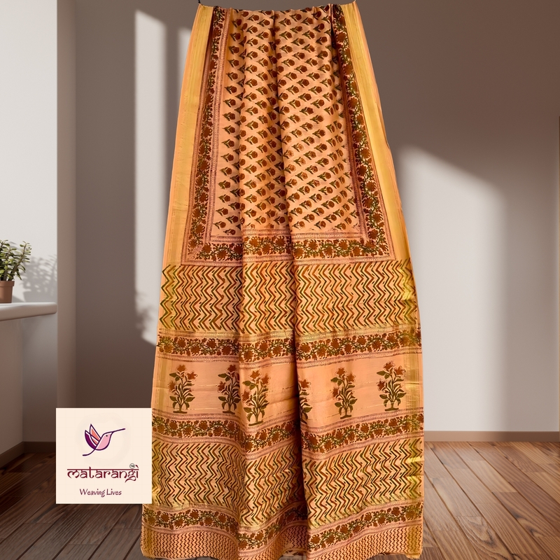 Matarangi Peach Hand Block Printed Premium Maheshwari Silk Saree