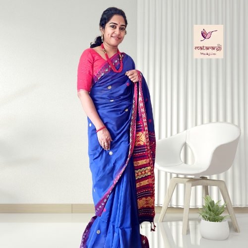 Beauty meets heritage in this Navy Blue Handloom Muslin Cotton Jamdani Saree. Perfect for special occasions, these sarees blend tradition with breathable luxury. This saree is paired with a running blouse.