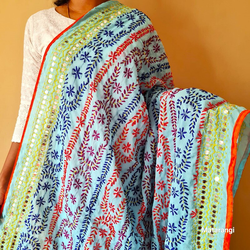 This Light Blue Chapa Phulkari dupatta dazzles with its intricate stitchwork, blending rich color palettes and timeless design.