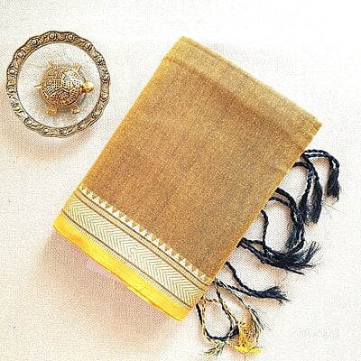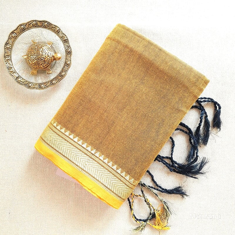 Treat yourself to this stunning Golden Brown Handloom Saree. The thin intricate weaving pattern on the border and the airy feather-like light weight feel of this saree embraces the fusion of craftsmanship and comfort, and makes it a perfect choice for casual wear and formal wear. This saree is paired with an unstitched running blouse.