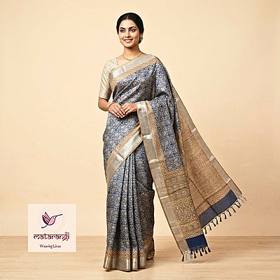 Matarangi Blue Printed Tussar Floral Saree