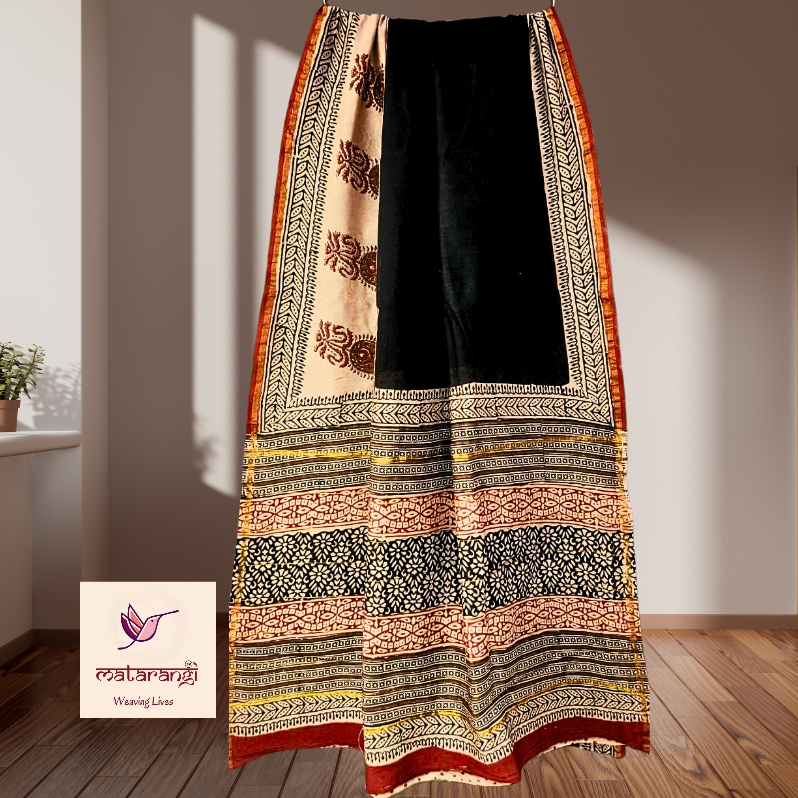 Black Hand Block Printed Organic Chanderi Silk Saree