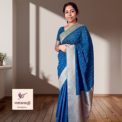 Embrace the beauty of this Teal Blue Elegant Kaddi Crepe Georgette Saree adorned with intricate Banarasi weave, blending sheer grace with timeless luxury. This saree is paired with a contrast blouse with banarasi weave.