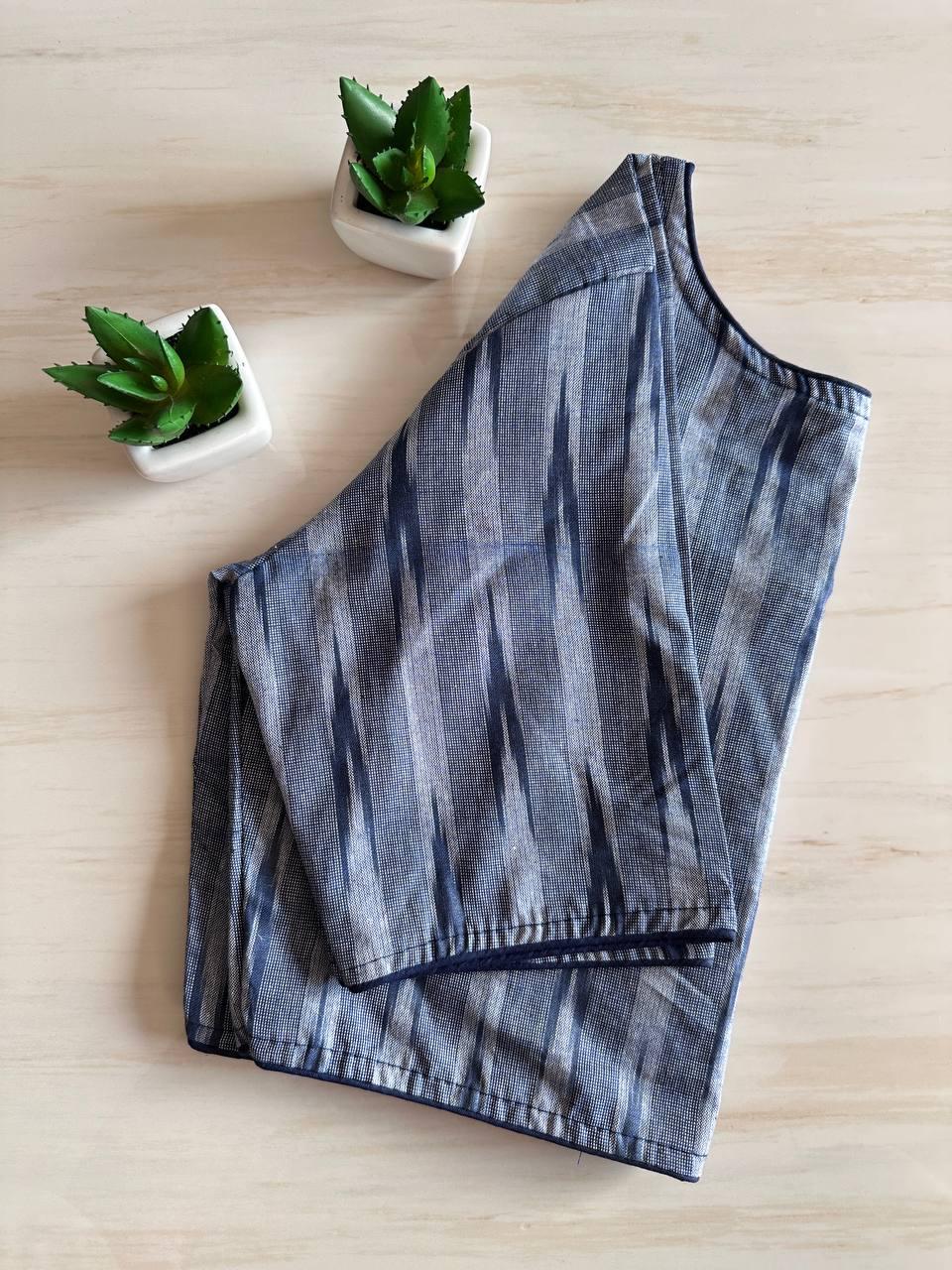 Elevate your style with this Blue Ikkat printed Ready made blouse that combines modern design with classic charm. Crafted from high-quality cotton fabric, this blouse offers a comfortable fit with the required alteration for sizes from 32 to 38 inches. Experience the perfect blend of style and comfort with this princess cut blouse, designed to make you feel confident and beautiful. This blouse is adorned with piping made from a complementary fabric and is sewn along the edges of the neckline, sleeves, and seams, creating a polished and defined look.