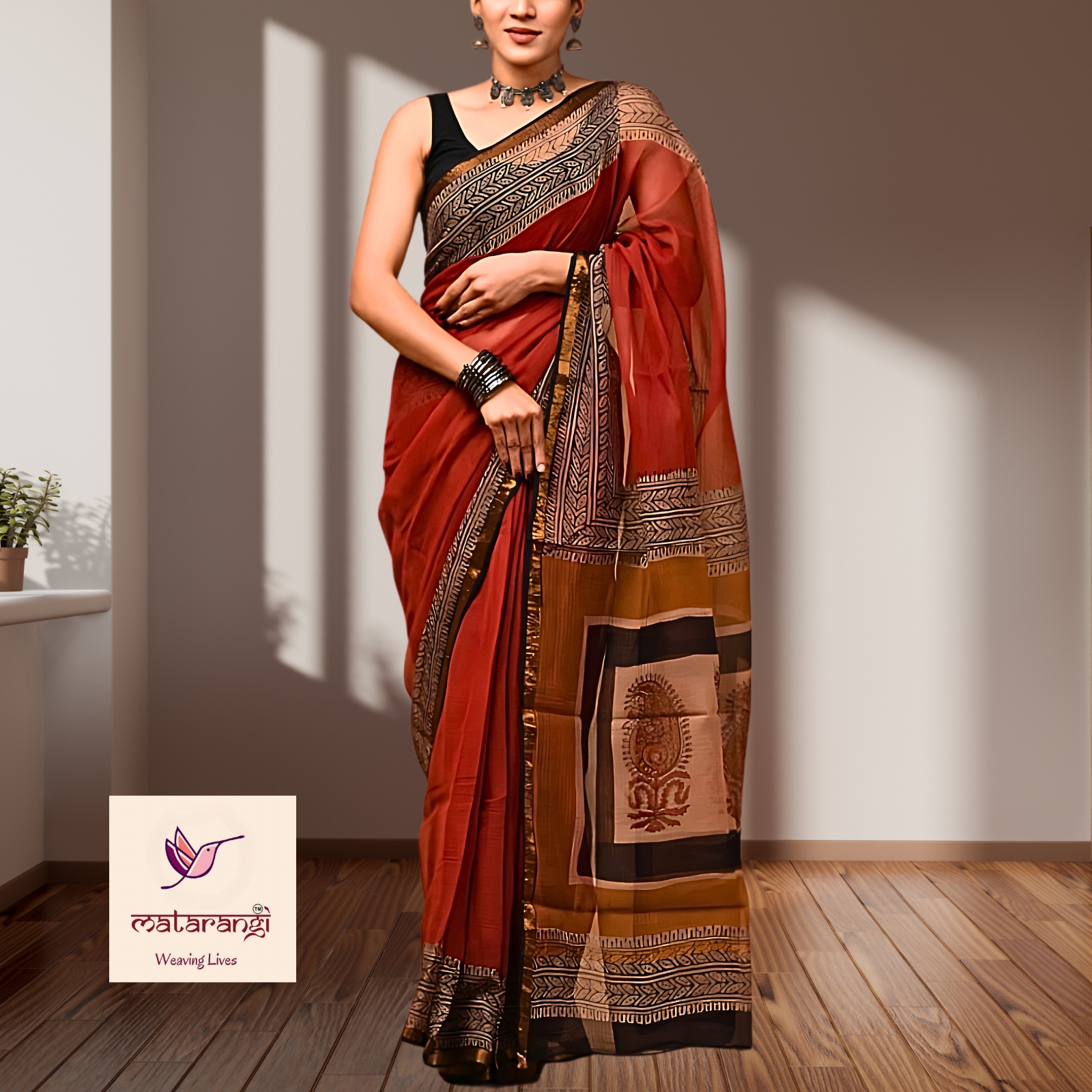 Blouse Colour & Pattern: Hand block Print with Zari weaving border