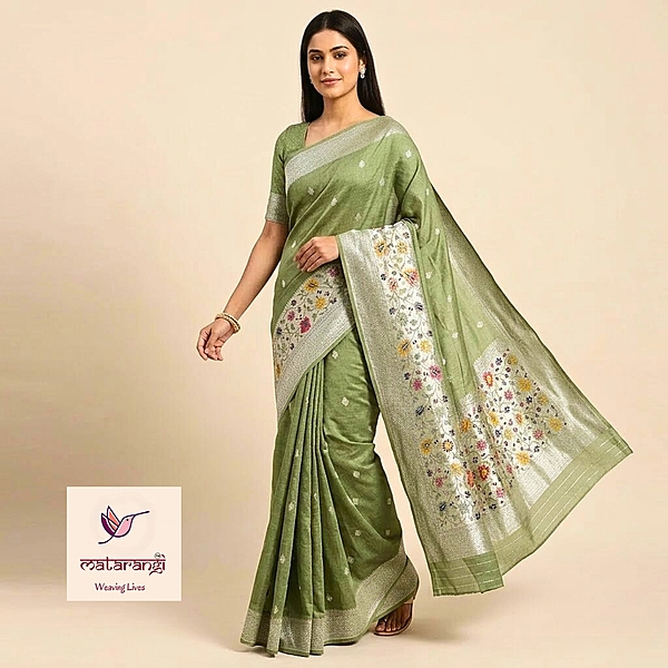 Drape the earthy beauty of the Matarangi Green Woven Tussar Silk Saree, complemented by a matching blouse for a look that reflects pure elegance.