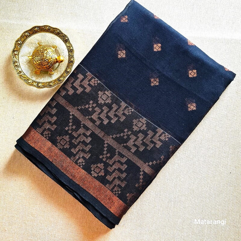 Adorn yourself in the celestial beauty of our Black Handloom Saree with broad design golden weaving border. With each gentle fold, immerse yourself in the serenity of tradition. This saree is paired with a running blouse