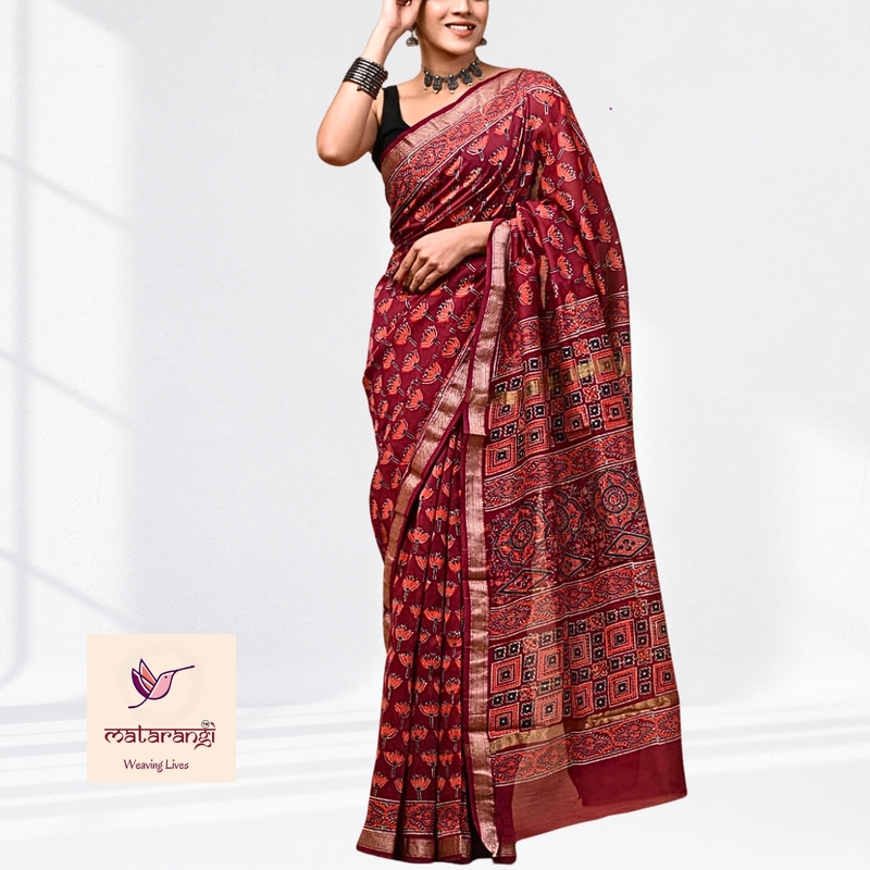 Matarangi Brick Red Floral HB Printed Premium Maheshwari Silk Saree