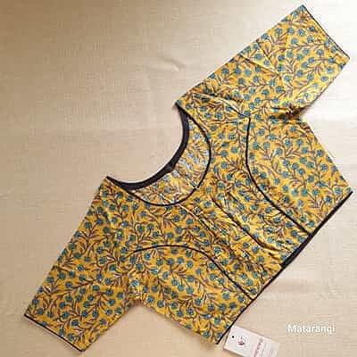 Elevate your style with this Floral printed Ready made blouse that combines modern design with classic charm. Crafted from high-quality pure cotton fabric, this blouse offers a comfortable fit with the required alteration for sizes from 32 to 38 inches. Experience the perfect blend of style and comfort with this princess cut blouse, designed to make you feel confident and beautiful. This blouse is adorned with piping made from a complementary fabric and is sewn along the edges of the neckline, sleeves, and seams, creating a polished and defined look.