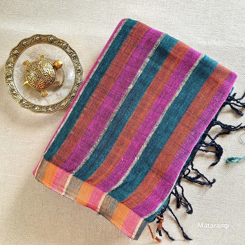 Matarangi Maroon & Green Striped Pure Organic Handloom Linen Saree