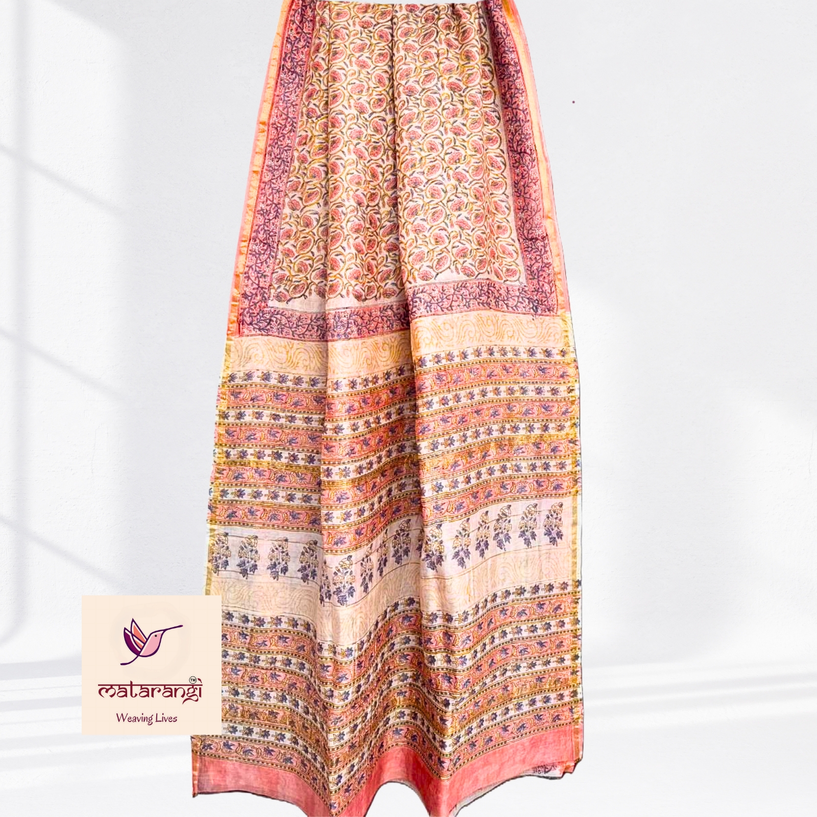 Matarangi Off White Floral Hand Block Printed Organic Chanderi Silk Saree