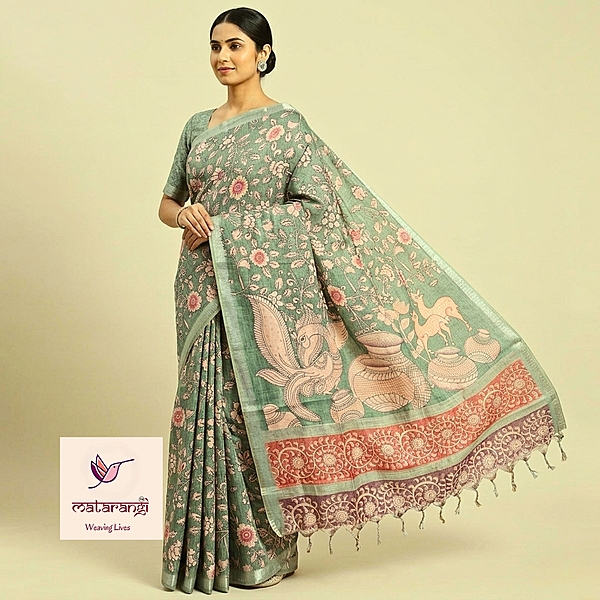 Matarangi Green Soft Tussar Silk Kalamkari Print Saree
