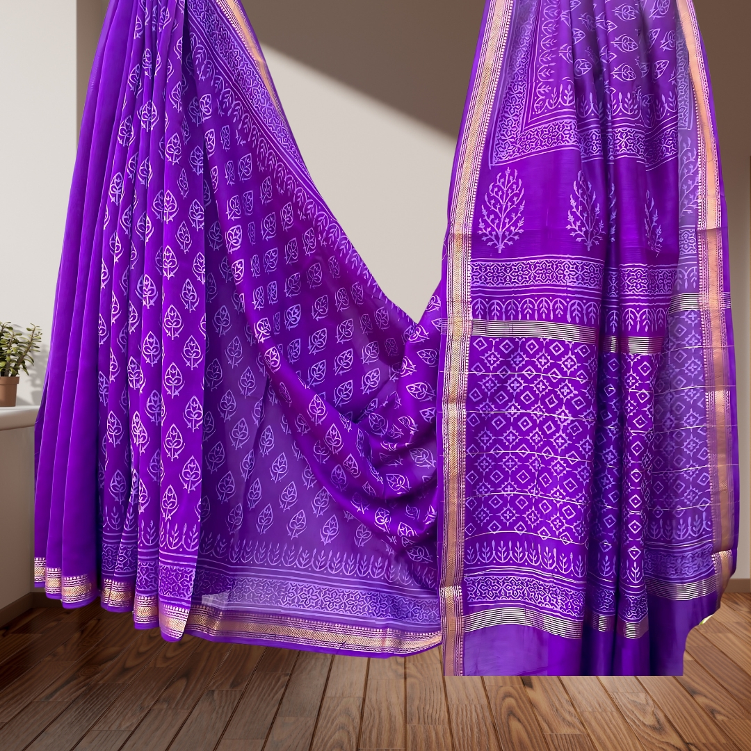 Premium Violet Floral Hand Block Printed Maheshwari Silk Saree