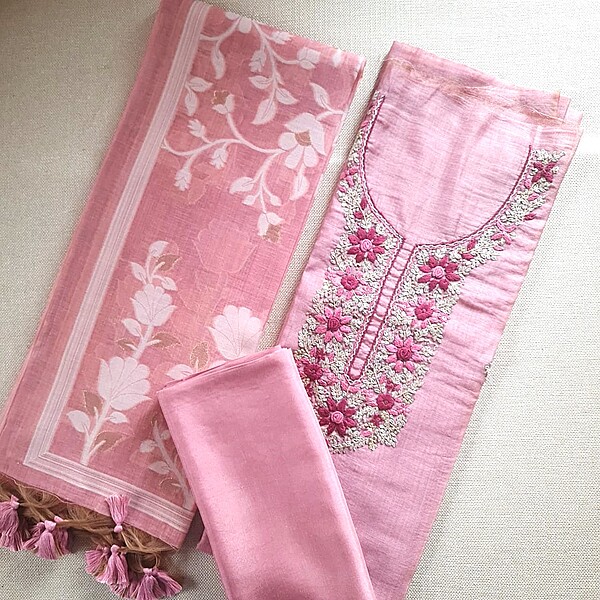 Grab our elegant unstitched salwar suit sets, perfect for casual and festive occasions. Crafted for comfort, this Light Mauve Silk Cotton Jamdani unstitched salwar suit set is sure to win your heart. Adorned with hand embroidery and paired with a Jamdani dupatta, this is a classy wear for any occasion.