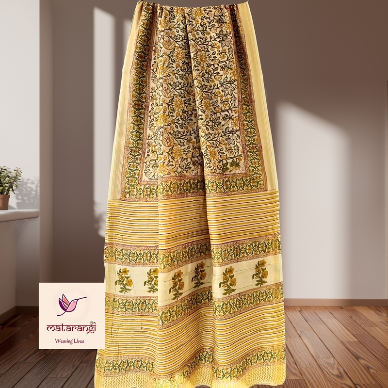 Matarangi Pastel Yellow Hand Block Printed Premium Maheshwari Silk Saree