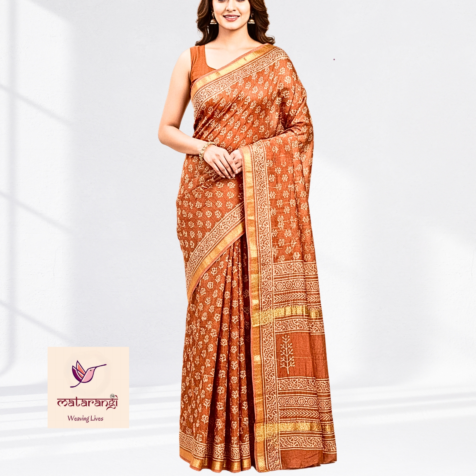 Matarangi Brown Hand Block Printed Premium Maheshwari Silk Saree