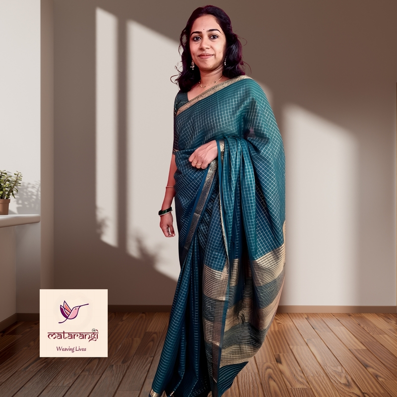 Matarangi Dark Green Red Crape Checked Pattern Saree