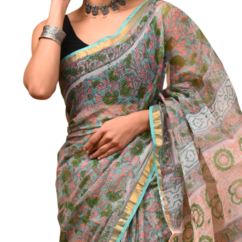 Matarangi Teal Blue and Green Hand Block Printed Pure Kota Saree