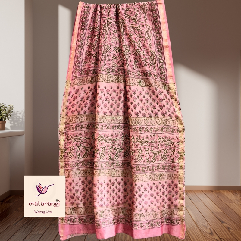 Matarangi Pastel Pink Hand Block Printed Premium Maheshwari Silk Saree