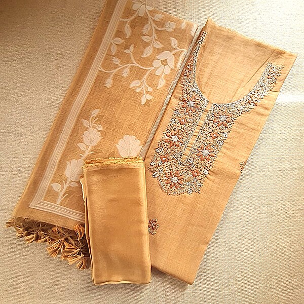 Matarangi Beige Silk Cotton Jamdani Chaappa Work Salwar Material