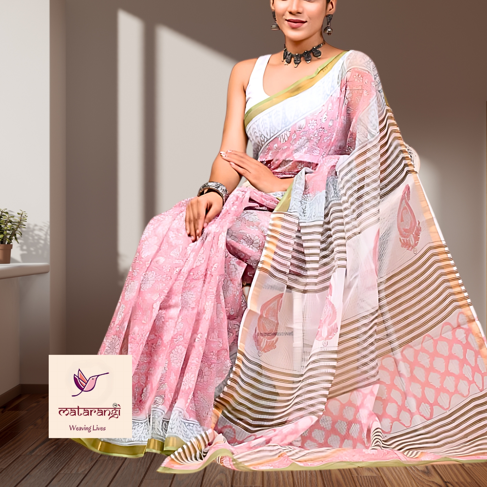 Blouse Colour & Pattern: Hand block Print with Zari weaving border