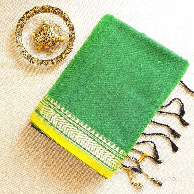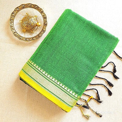 Treat yourself to this stunning Green Handloom Saree. The thin intricate weaving pattern on the border and the airy feather-like light weight feel of this saree embraces the fusion of craftsmanship and comfort, and makes it a perfect choice for casual wear and formal wear. This saree is paired with an unstitched printed multicolor running blouse.