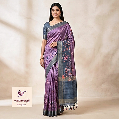 Drape yourself in the serene charm of Purple, woven beautifully in soft Tussar silk. A perfect harmony of subtle shine and timeless sophistication. The digital floral prints and intricate weave that runs throughout the saree makes it a unique ensemble. This saree is paired with a Teal Blue blouse.