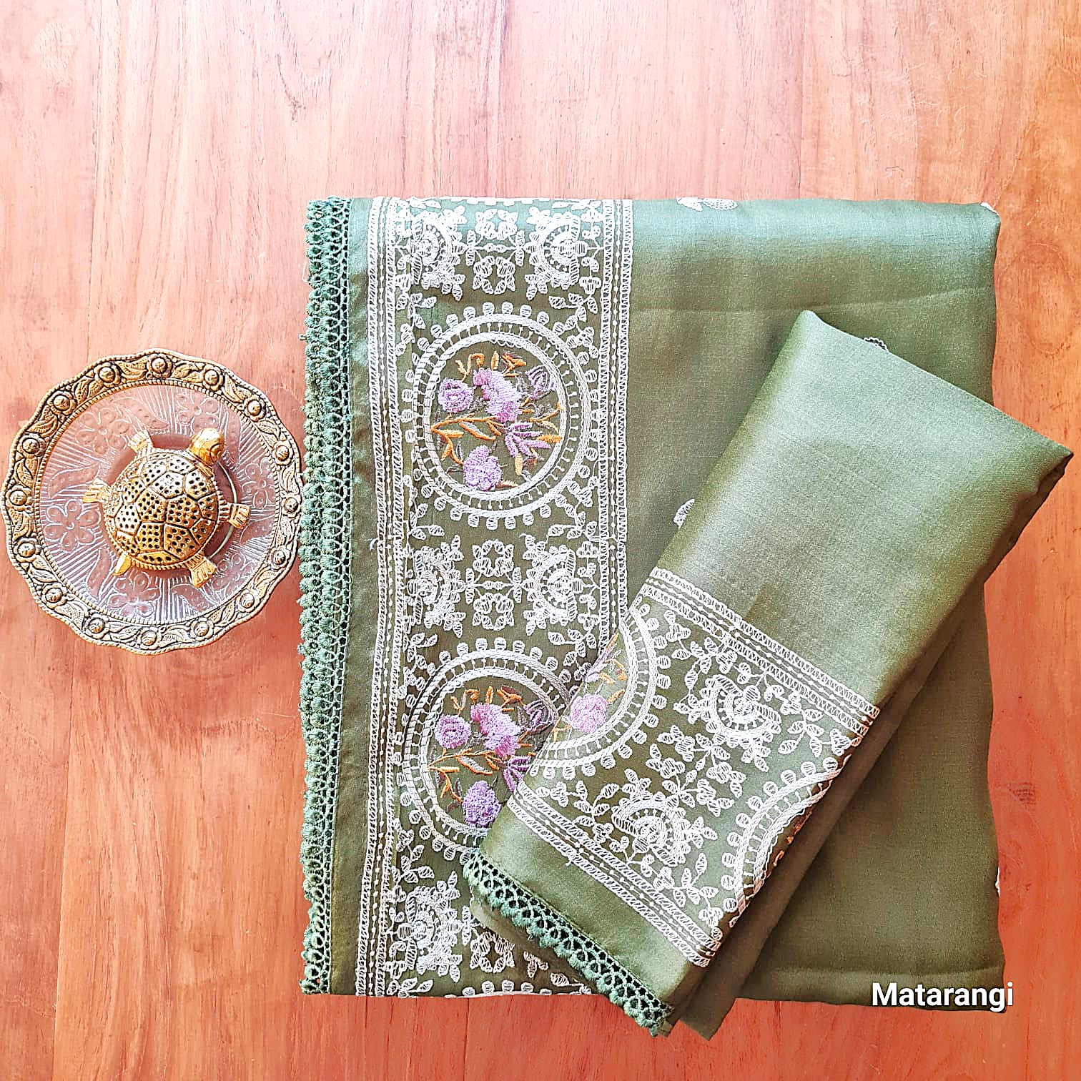 Blouse Colour & Pattern: Green with broad embroidery on the border