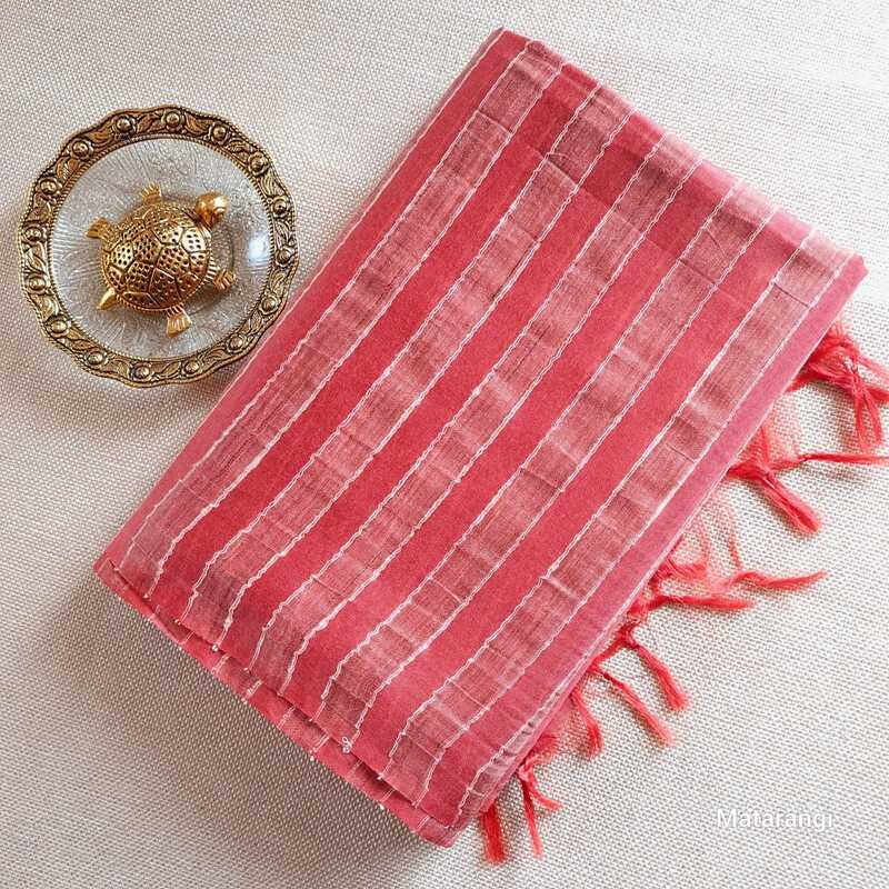 A fusion of traditional Tussar silk with a semi-sheer texture, this elegant Brick Red Semi Tussar Saree offers a lightweight and elegant drape, perfect for both casual and festive occasions. This saree comes in a striped pattern and is paired with an unstitched plain Brick Red blouse.