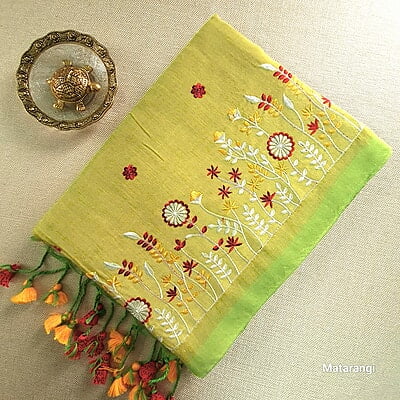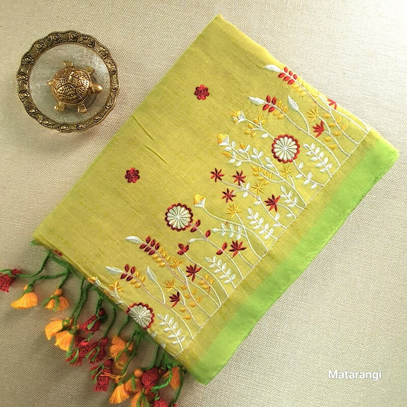 Lime Green Embroidered Pure Cotton Saree
