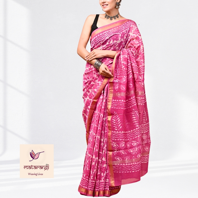 Make a fashion statement with our Pink Hand Block Printed Maheshwari Silk Saree. Woven using silk threads, these sarees are embellished with a gold Zari border to make them a seamless choice for both casual and festive occasions.