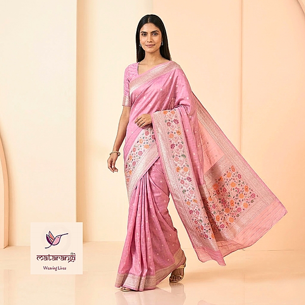 Drape the earthy beauty of the Matarangi Pink Woven Tussar Silk Saree, complemented by a matching blouse for a look that reflects pure elegance.