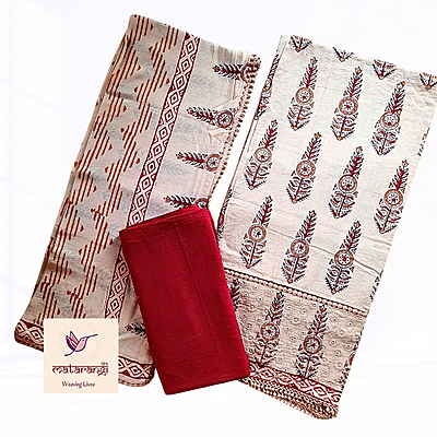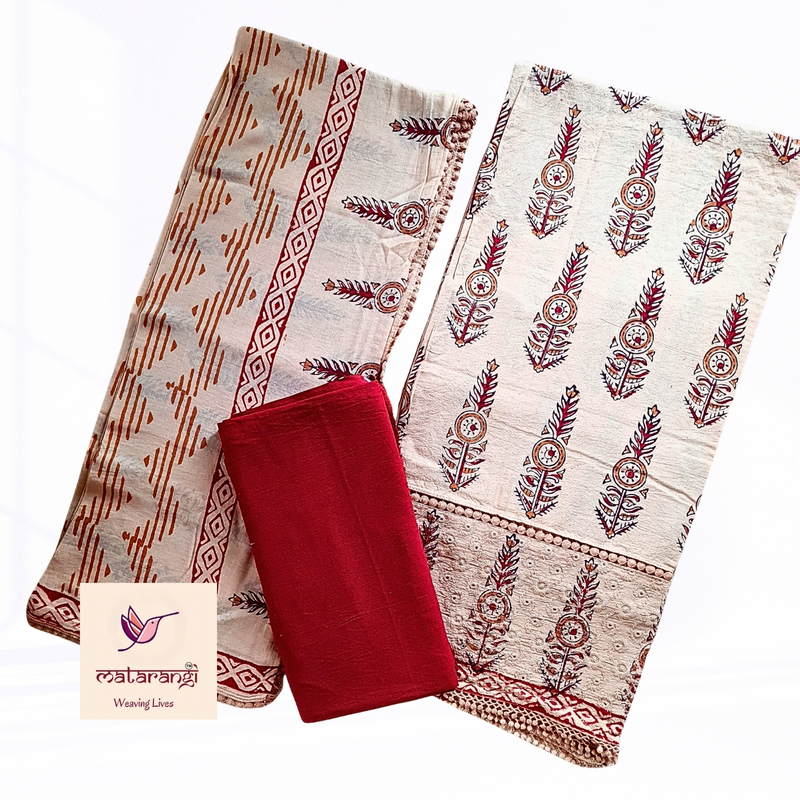 Grab our elegant unstitched salwar suit sets, perfect for casual and festive occasions. Crafted for comfort, this Beige & Maroon Pure Mulcotton Hand block printed unstitched salwar suit set is sure to win your heart