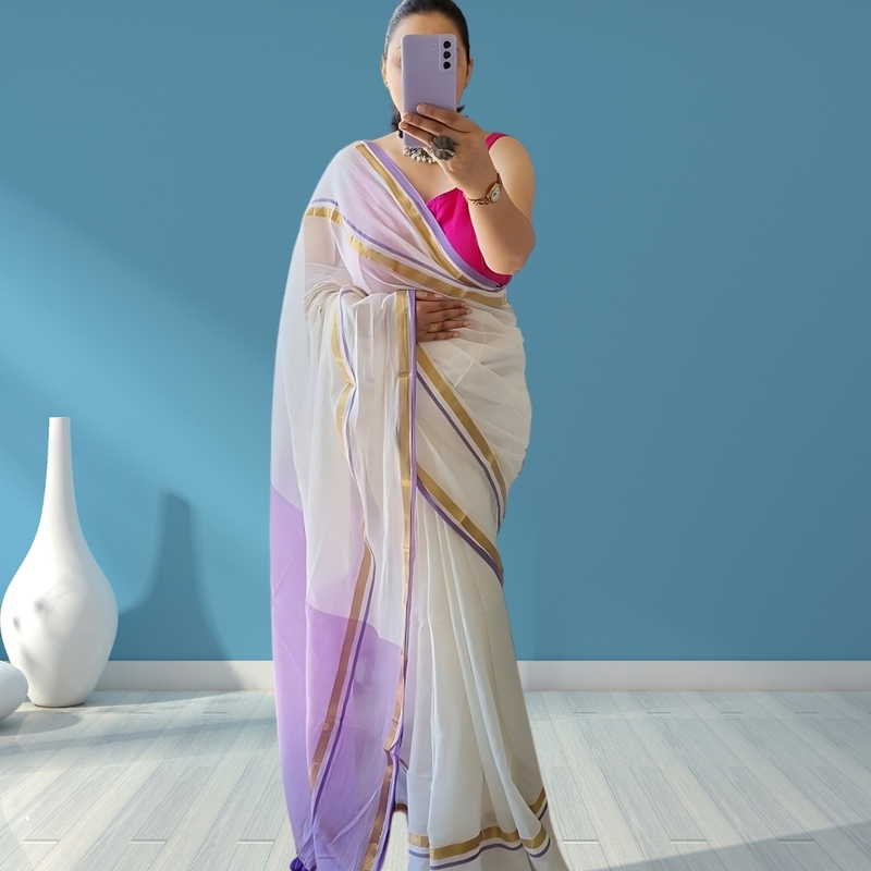 Experience timeless elegance with our Off White & Purple Mul Cotton Kerala Saree. Lightweight and breezy,this saree drapes gracefully, accentuating the silhouette while offering comfort, making it ideal for varied occasions. Pair it with a blouse of your choice and cast a spell of enchantment wherever you go.