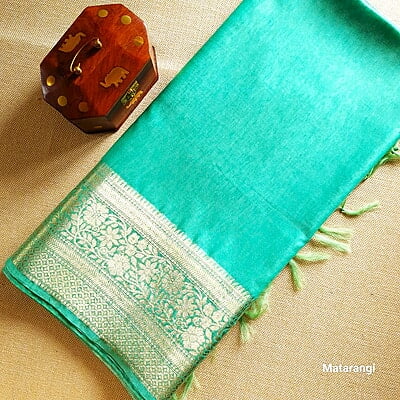 Pastel Cyan Blue Pure Tussar Linen Silk Banarasi Saree