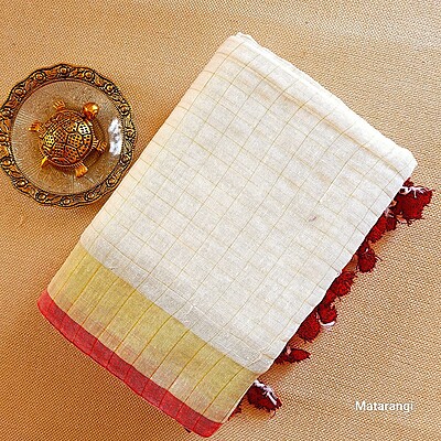 Adorn yourself in the celestial beauty of our Offwhite Organic Linen Check Saree design with Gold zari weaving border. With each gentle fold, immerse yourself in the serenity of tradition. This saree is paired with a running blouse