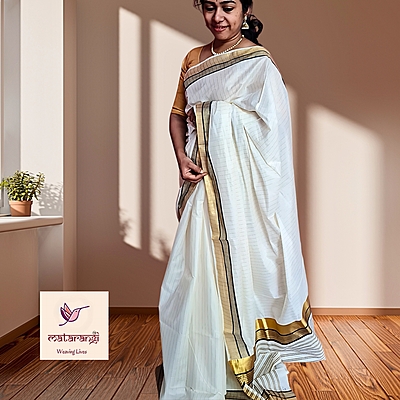 Weave stories of tradition with this light Tissue Cotton Kerala Saree. Minimalist yet regal with its signature striped border in Gold and Black, this saree speaks of elegance in every drape. This saree is paired with a running blouse.