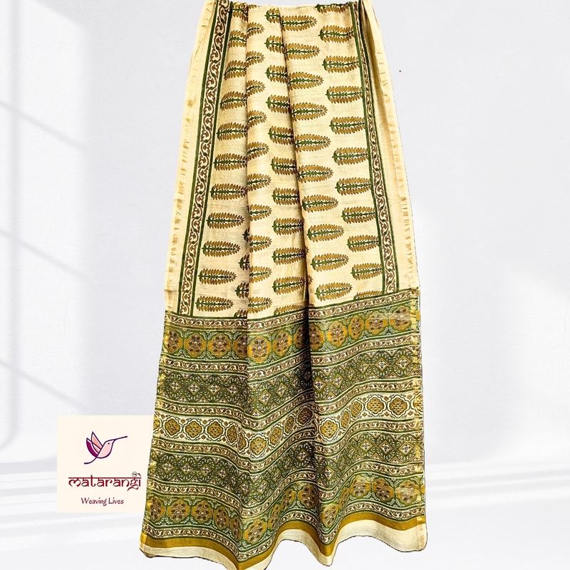 Matarangi Off White Big Floral Hand Block Printed Organic Chanderi Silk Saree
