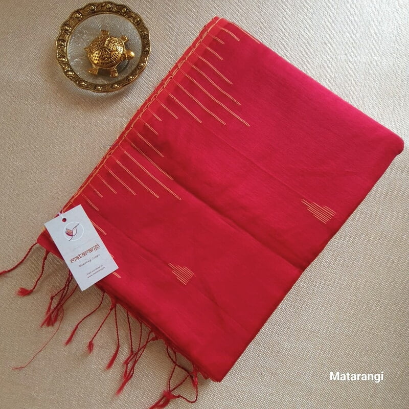 Embrace the fusion of elegance and craftsmanship in our Red Handloom Silk Cotton with Temple Border. This saree is paired with an unstitched Red running blouse.